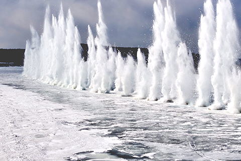 中俄界江黑龍江上游開始防淩汛爆破作業 2026-04-02 03:30:00 ◎ 四月一日,中俄界江黑龍江上游開始防淩汛爆破作業。隨著爆破指令下達,當日,黑龍江呼瑪段冰封江面相繼掀起數十米高冰瀑。(王婷 攝)