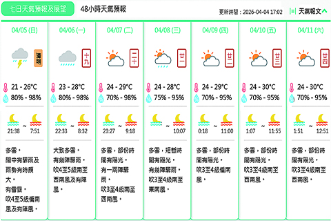 預測今日多雲。間中有驟雨及雨勢有時頗大。有雷暴。吹四至五級偏南風及有陣風。氣溫約為攝氏廿一至廿六度。相對濕度介乎百分之八十至九十八之間。預測最高紫外線指數約為五,級別屬於中等。◇