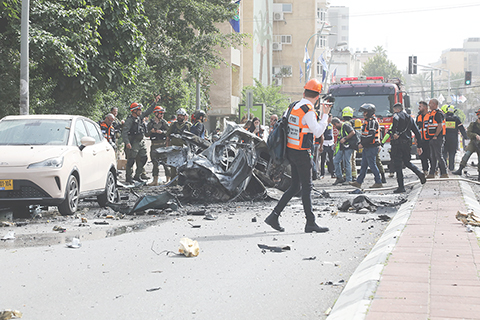 ◎ 伊朗伊斯蘭革命衛隊公共關係部門四月四日發表聲明說,伊朗已發動「真實承諾-4」行動第九十五波攻勢,使用多彈頭導彈持續密集打擊了以色列多地。圖為當日,在以色列中部城市拉馬特甘,應急反應人員在導彈襲擊現場參與處置。(新華社發吉德翁.馬科維奇攝/基尼圖片社)