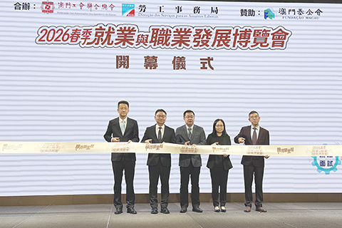 由勞工事務局與澳門工會聯合總會合辦,「二零二六春季就業與職業發展博覽會」昨日上午十時假澳門旅遊塔會展娛樂中心四樓舉行開幕式,中聯辦社會發展部處長孫志君、勞工事務局局長陳元童、工聯理事長江銳輝、澳門基金會綜合事務廳廳長陳頌欣、橫琴粵澳深度合作區民生事務局社會保障處副處長王錦濤等出席主禮。