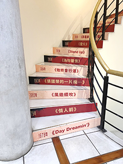 此外,上樓的梯級,還寫着多首歌曲的名稱,牆壁則掛着兩個漫畫家描繪的俏像素描,簡潔清晰的筆調,顯示哥哥風采依然。